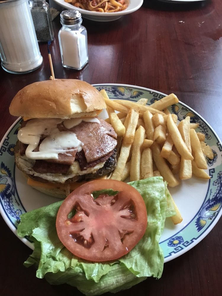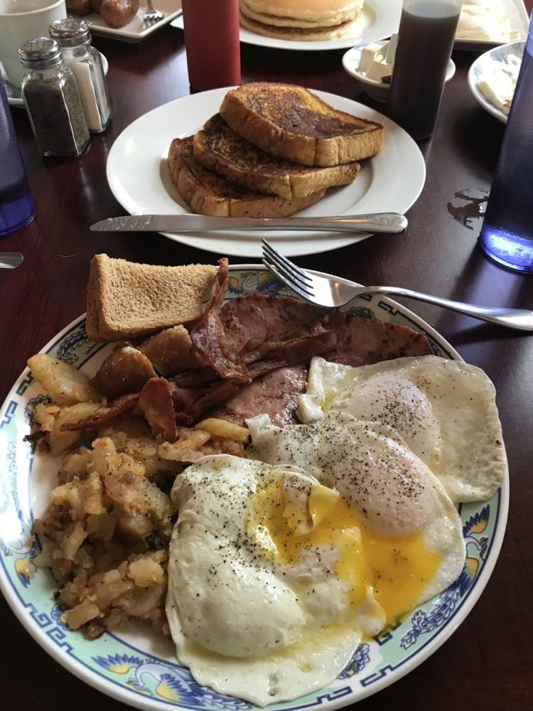 Everything sampler choice of pancakes or french toast, served with 3 eggs, ham, sausage, bacon, hash browns and toast.