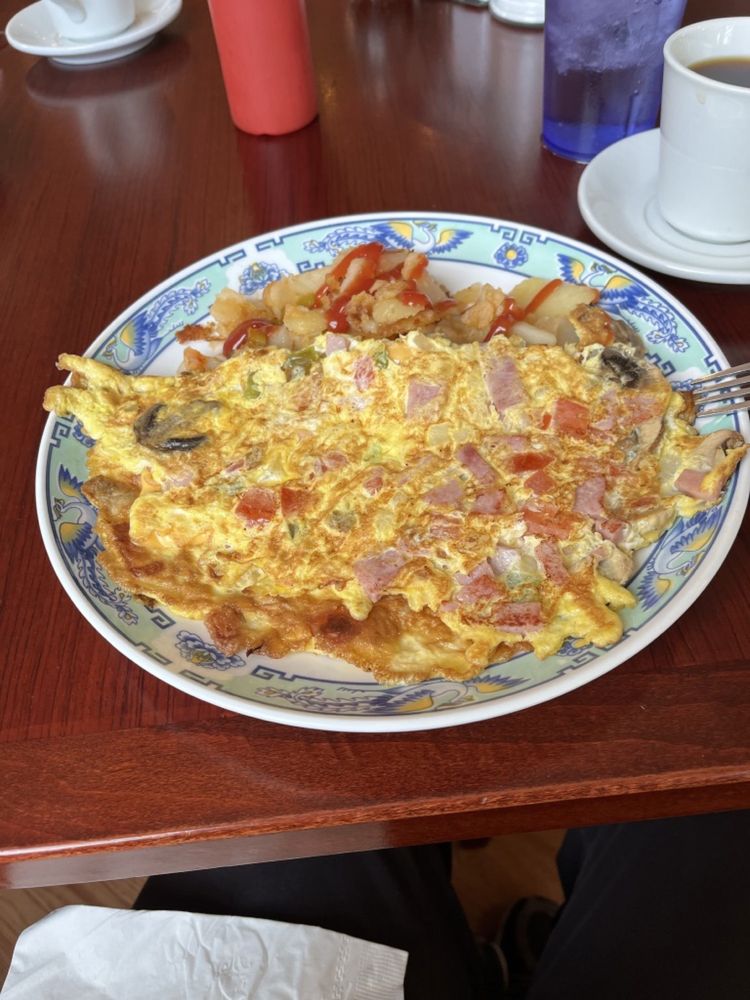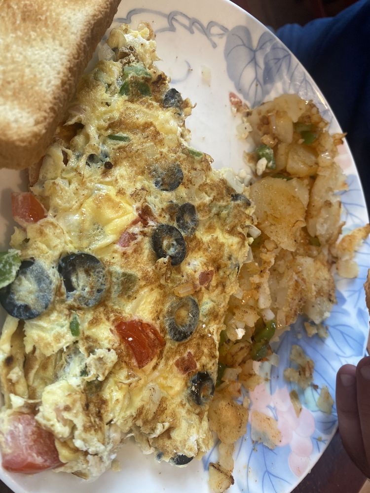 Garden state omelette includes peppers, onions, eggplant, zucchini, tomatoes and American cheese.