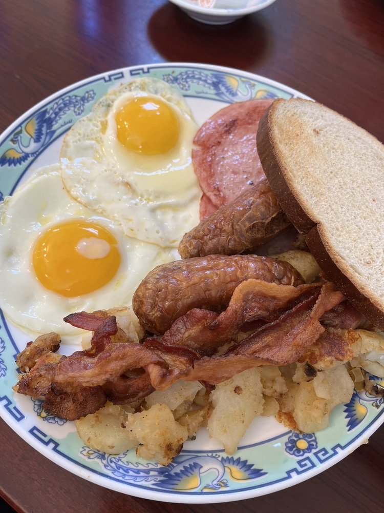 Eggs in any style with home fries 2 pieces of pork roll, 2 sausages and 2 slices of bacon and toast.