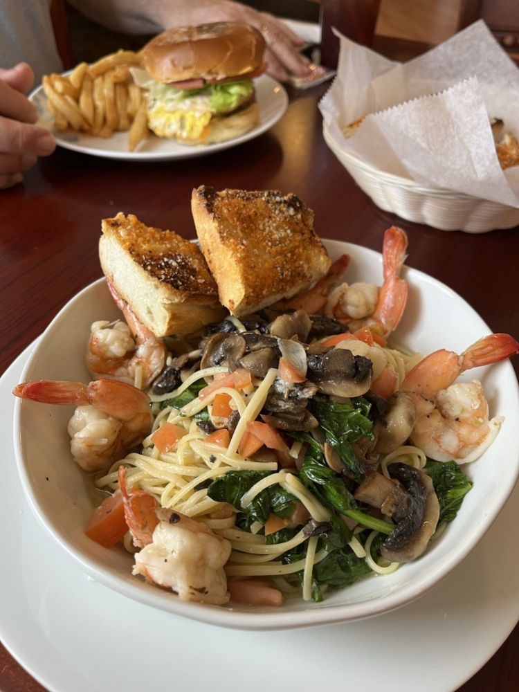 Linguine with shrimp, mushrooms, spinach and tomatoes.